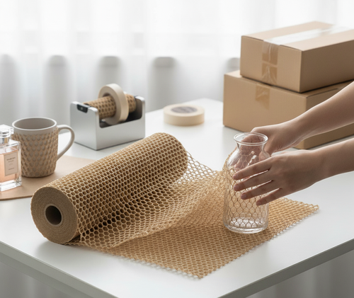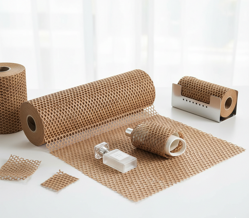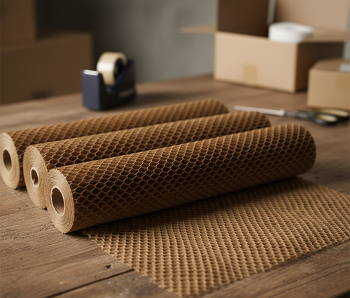 Honeycomb Kraft Paper Rolls are flexible protective wraps with a unique honeycomb structure. They are lightweight, eco-friendly, and provide excellent cushioning, making them a smart alternative to plastic bubble wrap for packing and shipping.